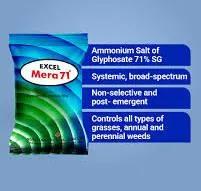 Excel Mera 71 is a high-performance, systemic, broad-spectrum, non-selective, post-emergent herbicide manufactured by Sumitomo Chemical India Ltd. (under the Excel Crop Care brand). The "71-1KG" refers to its active ingredient concentration—Glyphosate 71% SG (Soluble Granules)—packaged in a convenient 1 kg size, ideal for farmers and agricultural use. It's designed for effective weed control in crops and non-crop areas, helping to maximize yields by eliminating tough weeds that compete for nutrients, water, and sunlight.
